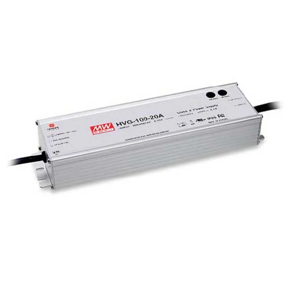 HVG-100 series is a 100W AC/DC LED driver featuring the dual mode constant voltage and constant current output. HVG-100 operates from 180~528VAC and offers models with different rated voltage ranging between 15V and 54V. Thanks to the high efficiency up to 91%, with the fanless design, the entire series is able to operate for -40℃ ~ +90℃ case temperature under free air convection. The design of metal housing and IP67/IP65 ingress protection level allows this series to fit both indoor and outdoor applications. HVG-100 is equipped with various function options, such as dimming methodologies, so as to provide the optimal design flexibility for LED lighting system.